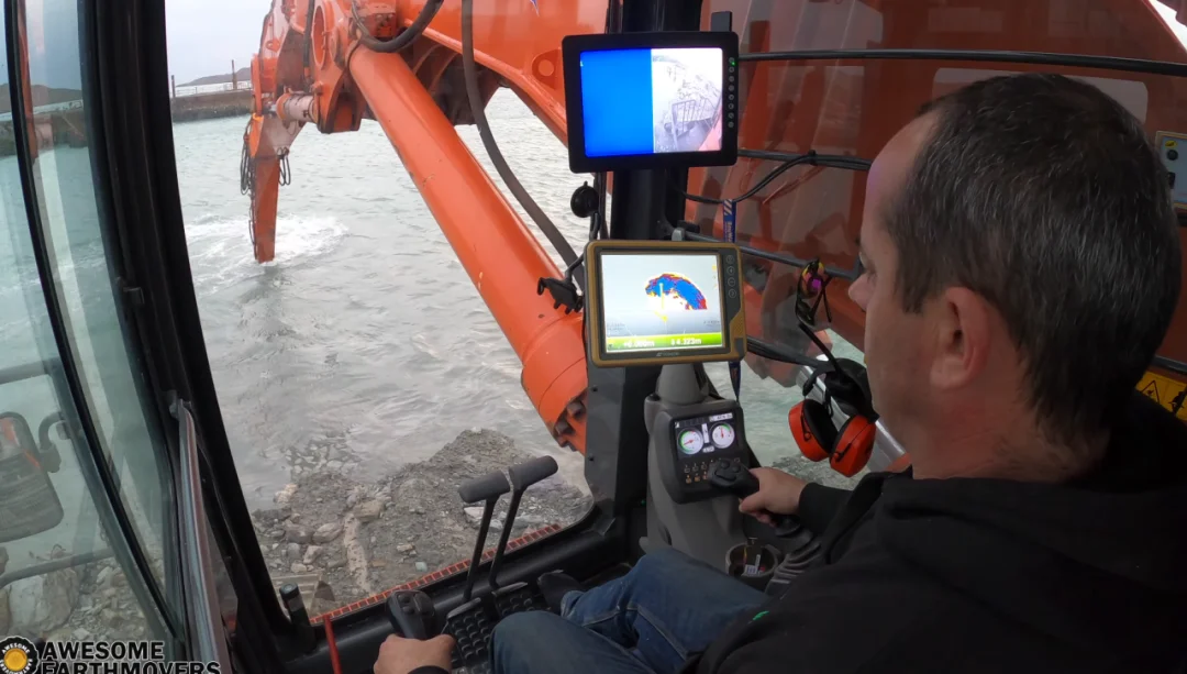 基于Topcon 3D挖机系统配套的GX控制面板,驾驶人员在驾驶室内通过屏幕就可以直观掌握当前工作的情况和质量,不再需要辅助测量人员反复测量堤坝的护甲的堆放位置和坡度,同时也保证了堤坝的高度,这减少了施工过程中的暂停和安全事故的发生。特别是在水下清淤作业时,更凸显Topcon 3D挖机系统的优势,挖掘过程不再需要辅助测量水深以确认水下清淤区域的挖掘情况,极大地减少了雇佣辅助人员的成本,提高了生产效率,并使得此项目成为了类似项目的典范。