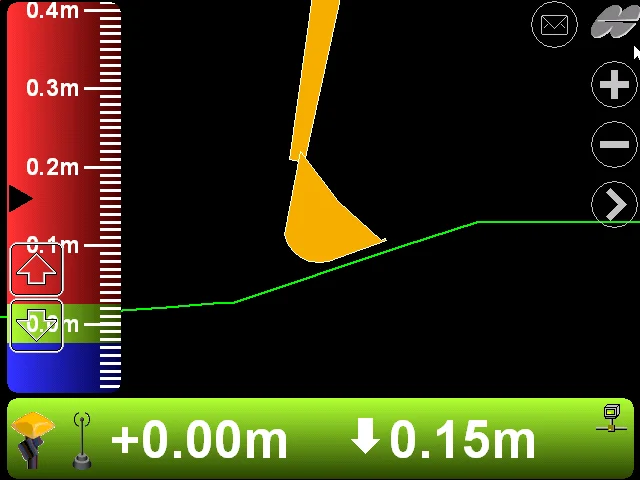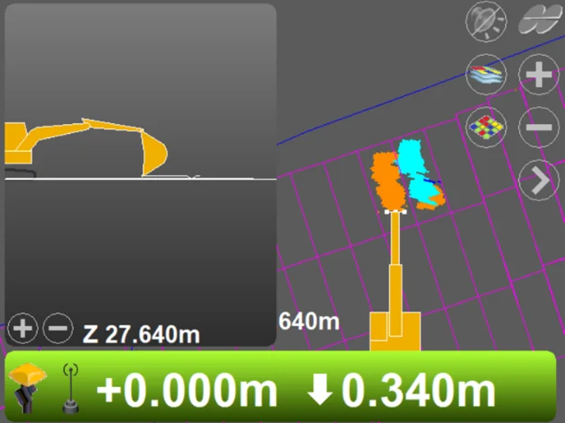 系统工作时,安装在挖掘机机身的GR-i3接收机和电台通过接收GNSS信号和基站发送的差分信号获得挖掘机实时的三维位置,然后结合安装在挖掘机大臂,小臂和挖斗连杆上的传感器测定的角度值实时计算出挖斗精确的三维坐标,并将坐标信息回传到安装在驾驶室里的显示器,系统通过比较数字化三维设计模型与当前挖斗所处位置信息,以模拟图形、数值和声音信号等多种方式指示实际挖斗与目标工作面的相对位置,引导操作手精确施工。