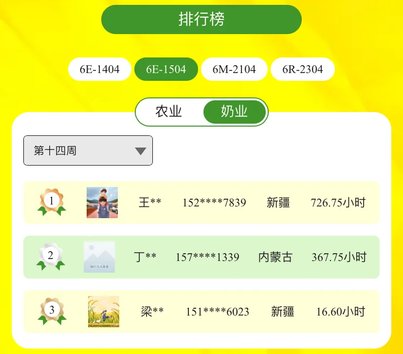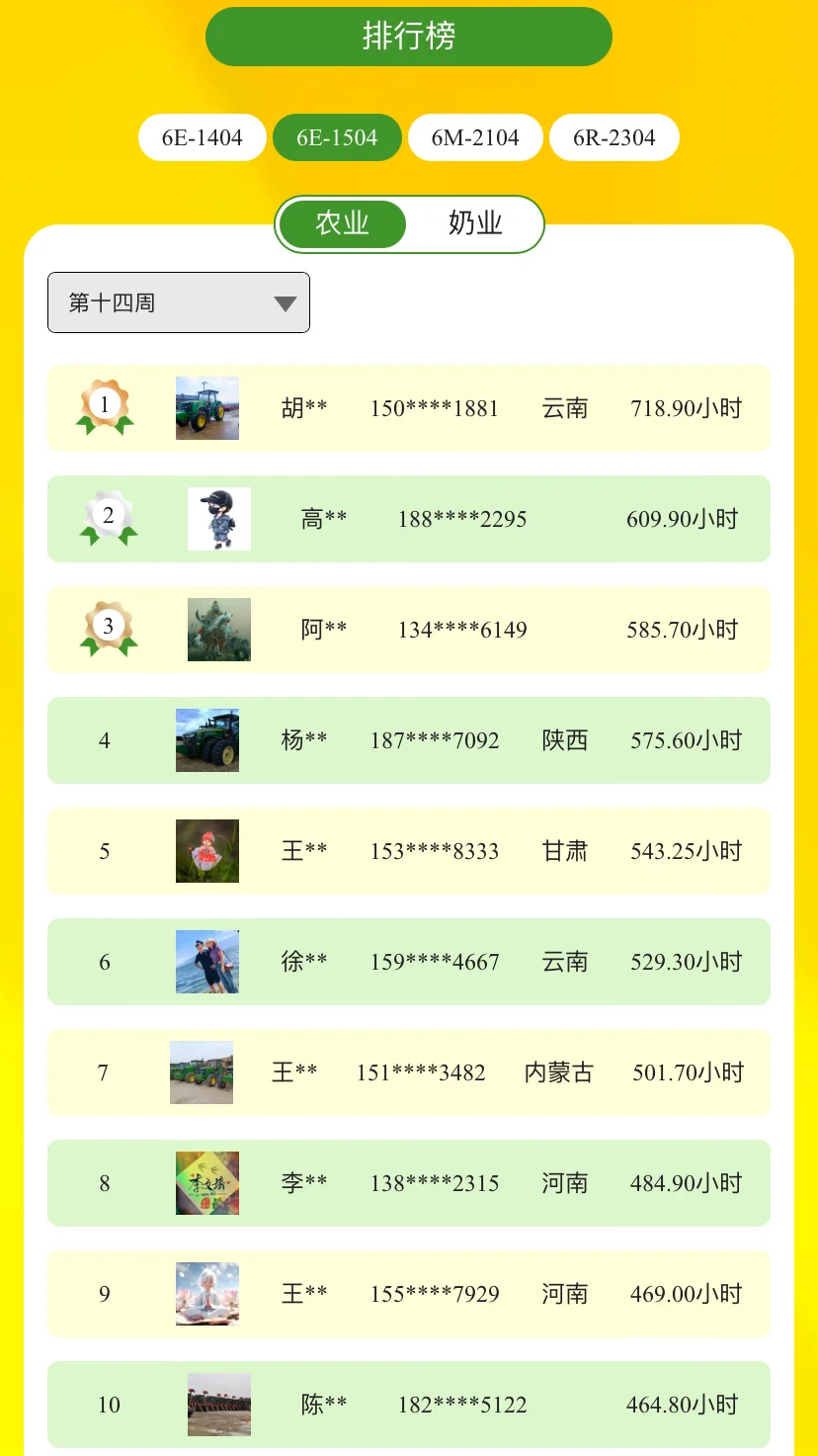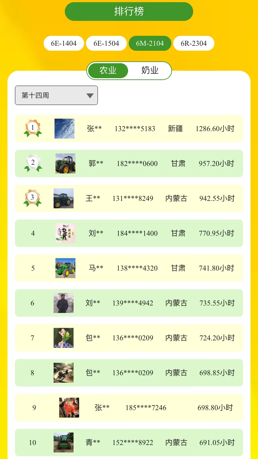 亲爱的迪尔农机手们,第二届约翰迪尔拖拉机作业锦标赛前十四周排名现已公布,邀您一同关注战报速递!