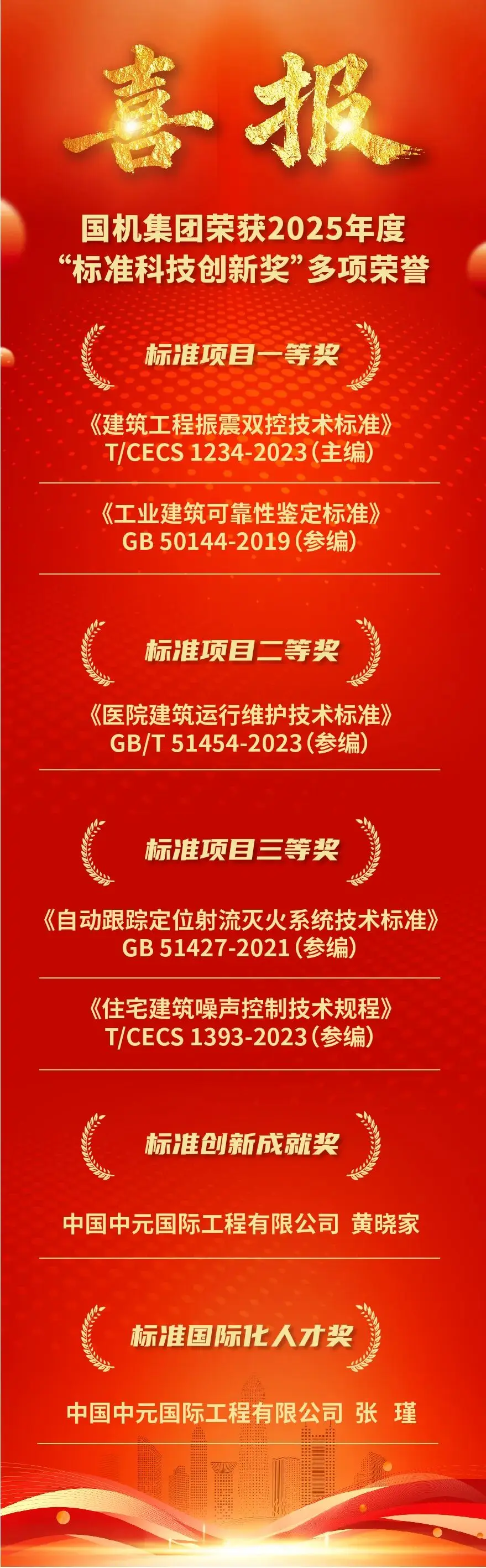 国机集团在学术大会上荣获2025年度'标准科技创新奖'多项荣誉,包括《建筑工程振震双控技术标准》和《工业建筑可靠性鉴定标准》两个项目。这些标准由国机集团首席科学家徐建参与编制,对建筑工程及工业建筑可靠性鉴定提供了重要指导。