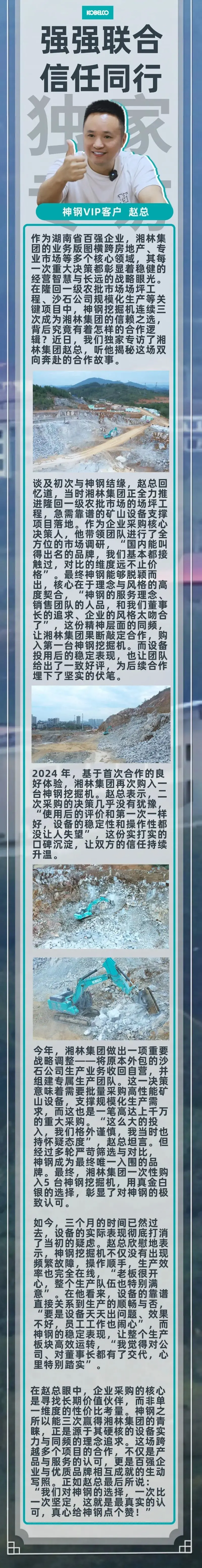 神钢建机KOBELCO发布文章,庆祝VIP客户选择了神钢的产品,强调这是理念上的契合和实力上的信赖。