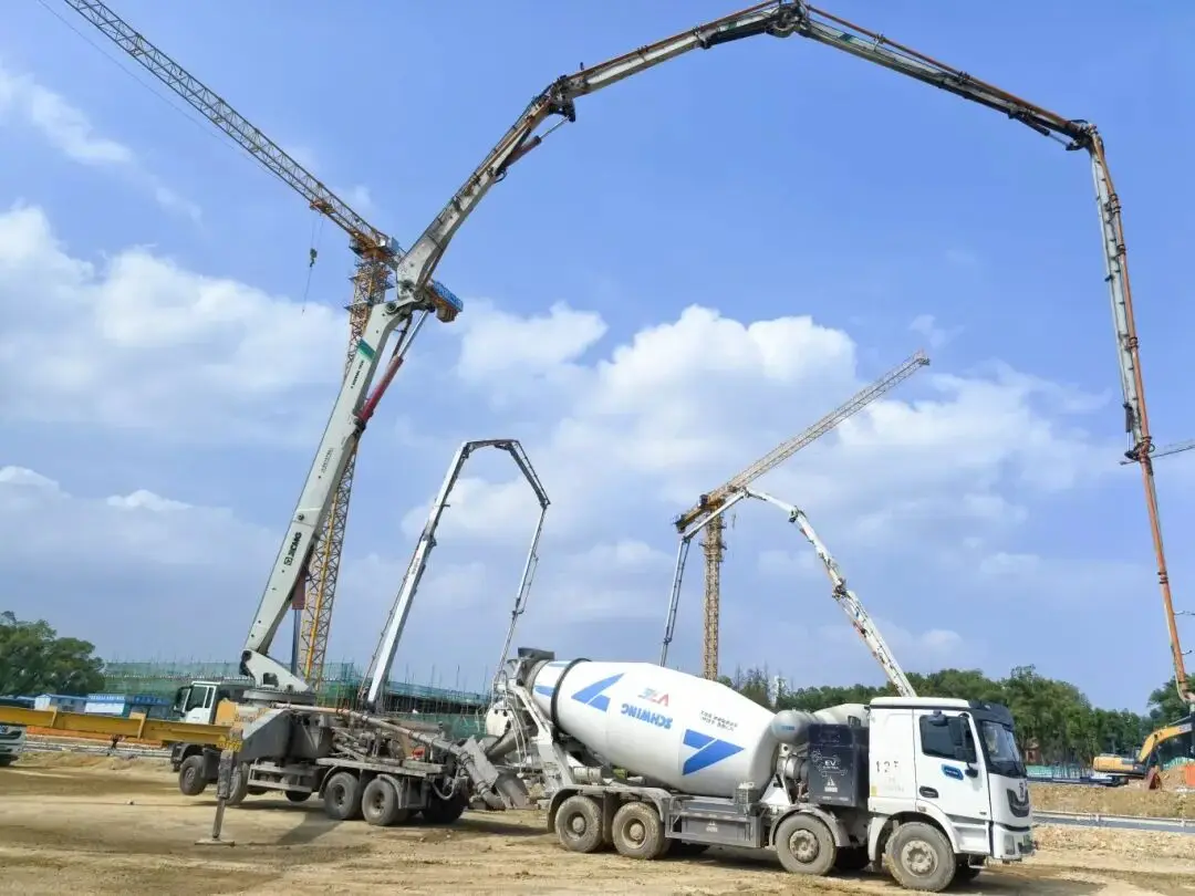 徐工混凝土机械为长江军事主题文化区-中山舰博物馆改造项目提供了一套1+2+10+1的成套化设备解决方案,包括HB72V和HB62V泵车以及新能源搅拌车和塔机等,成功完成了对质量要求极高的浇筑任务。