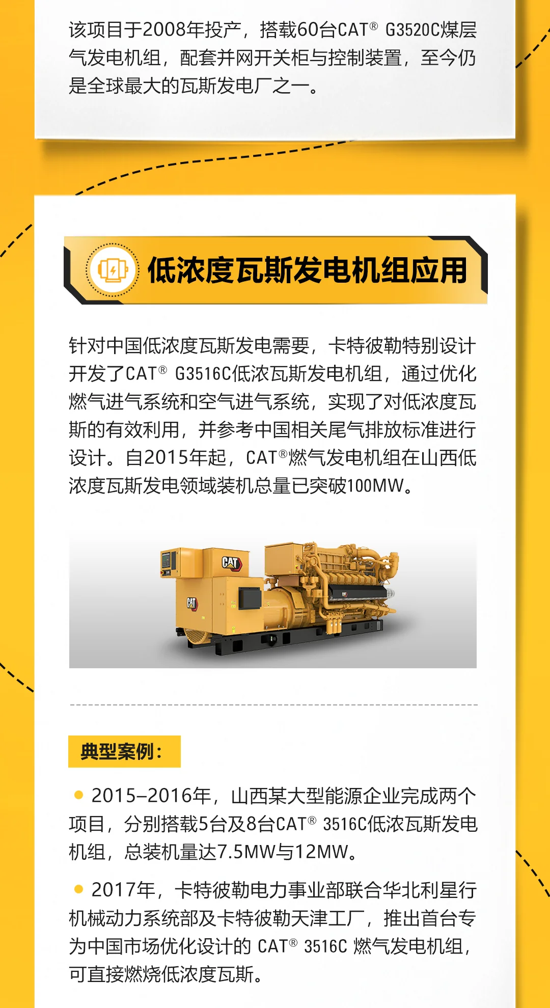 CAT卡特电力服务中心介绍了一种可靠的燃气发电解决方案,该方案旨在助力煤矿瓦斯资源化利用,提高能源利用效率,减少环境污染,并提到CAT卡特提供全球产品支持和客户价值协议。