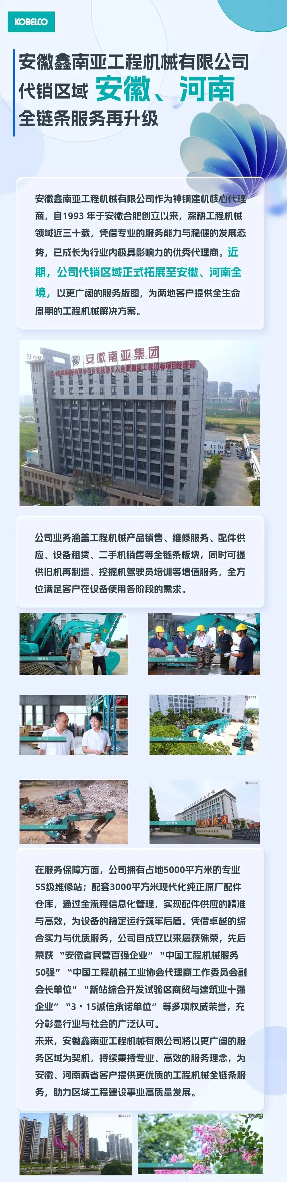 神钢建机KOBELCO官方宣布,安徽鑫南亚工程机械有限公司的代销区域已扩展至河南,同时全链条服务得到升级。