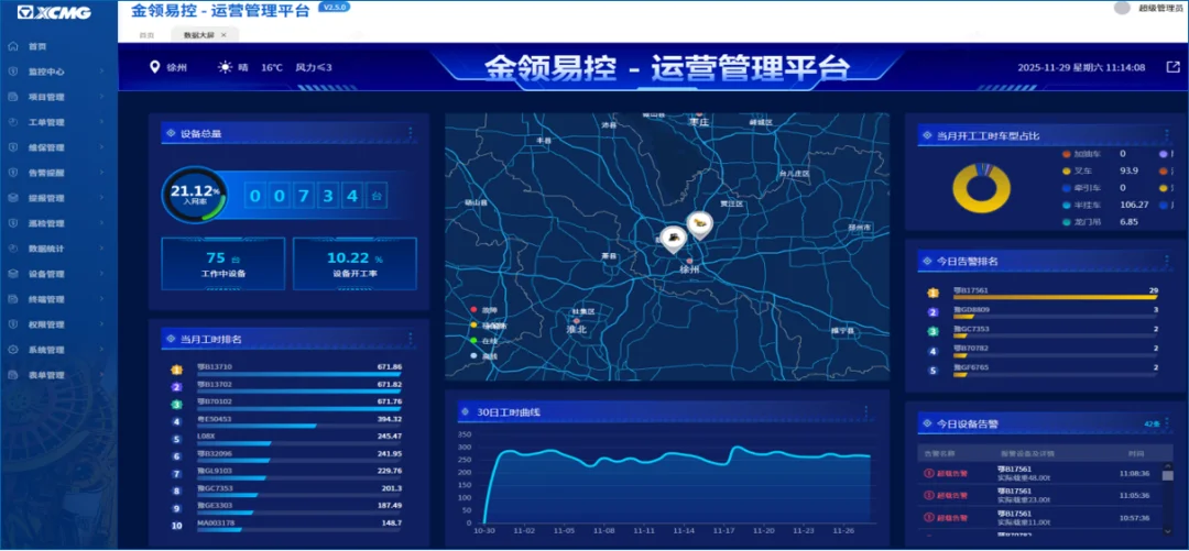徐工推出"五大无忧"全周期解决方案,其中"金领易控"数字化平台解决工程机械管理难题。通过物联网大数据实现设备远程监控、项目集中管理和安全预警,让老板"人在办公室,眼在工地上",重塑工程机械管理逻辑,从钢铁力量转向数字智慧。