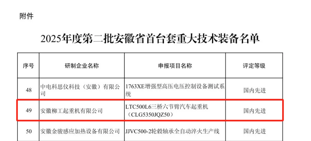 安徽柳工自主研发的LTC500L6三桥六节臂汽车起重机入选安徽省2025年第二批首台套重大技术装备名单,这是该公司连续8年、累计9款产品获此认定。该产品采用先进技术,具备智能化程度高、节能效果显著等优势,可应用于多个关键领域。