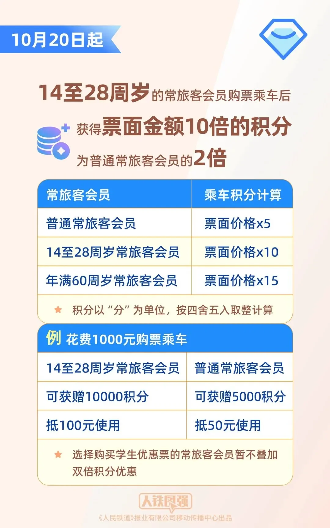 中国国家铁路集团有限公司宣布优化升级“铁路畅行”常旅客会员服务,为14至28周岁的会员提供更大积分优惠并新增座位升席功能,进一步拓展积分应用场景,使旅客获得更多实惠。