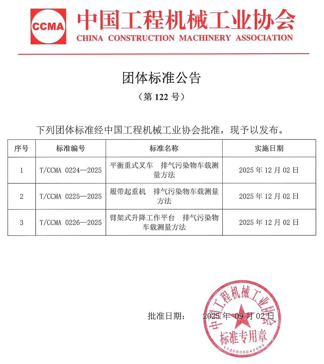 中国工程机械工业协会团体标准公告(第122号)