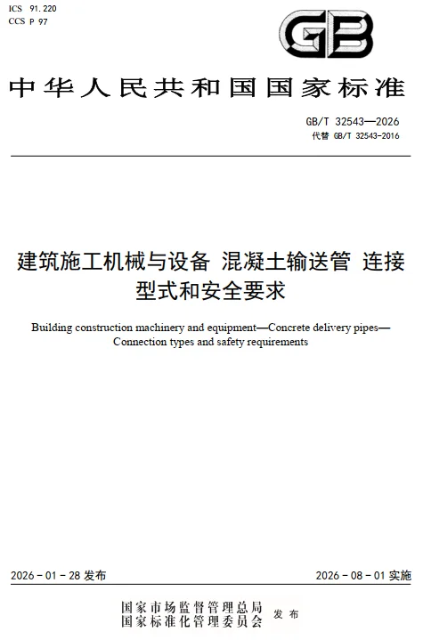 中联重科主导的国家标准GB/T 32543-2026《建筑施工机械与设备 混凝土输送管 连接型式和安全要求》正式发布,该标准明确了混凝土输送管的安全要求,将引导行业安全健康发展,体现公司技术领先地位。