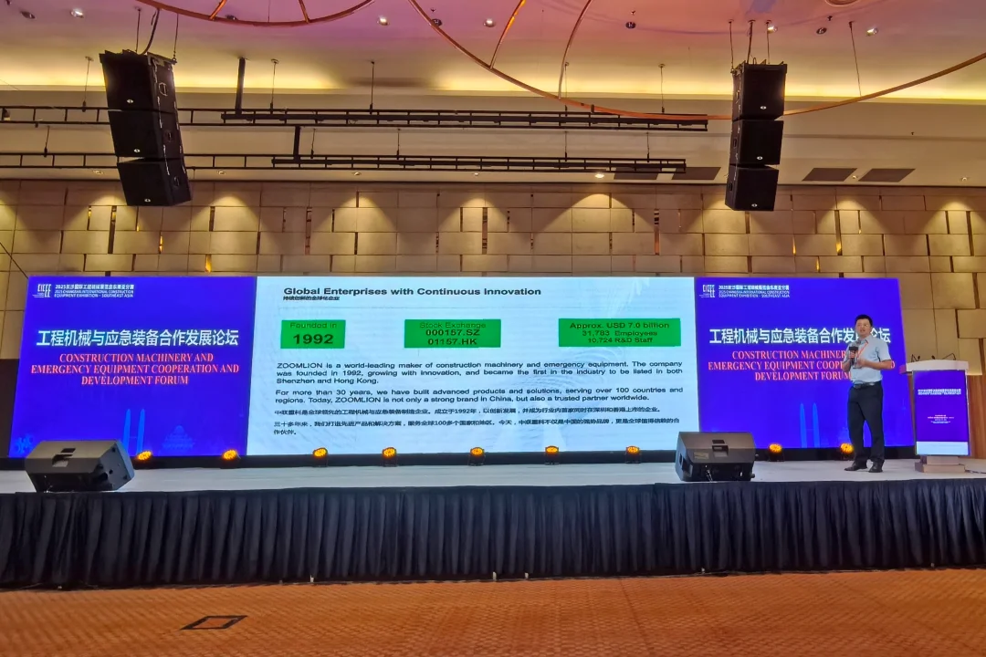 中联重科应急装备公司参加第三届长沙国际工程机械展览会东南亚分展,并在论坛上发表关于中国应急装备产业国际合作实践的主题演讲。公司展示了先进的应急装备与技术,黄院长分享了行业经验及国际合作成果。