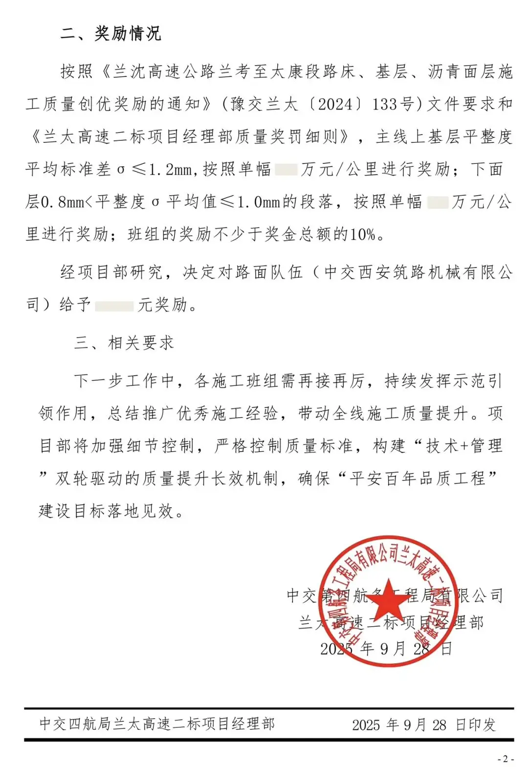 中交西筑的路面工程分公司参与建设的兰太项目,在施工质量创优核验中获得表彰。项目表现亮眼,其平整度指标符合优秀标准,分公司计划总结并推广该项目的优秀施工经验,提升整体施工质量。