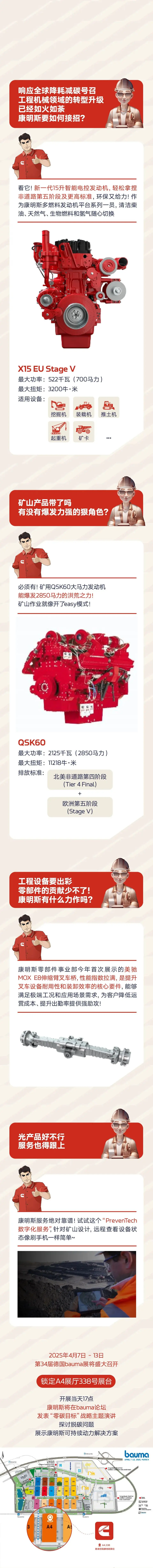 康明斯在bauma 2025展会上展示了新一代15L非道路发动机,这是一款多燃料重型发动机平台,适用于工程机械、农机和工业设备,具有高效率和低排放的特点。