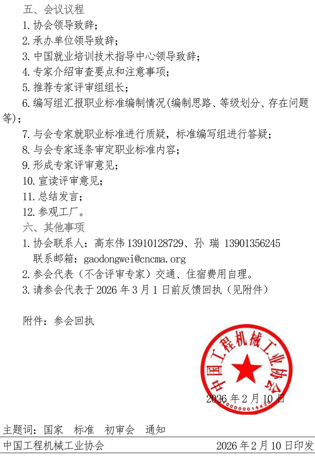 中国工程机械工业协会将召开《工程机械装配调试工》国家职业标准初审会,委托单位为人社部国家职业技能鉴定中心,承办单位为柳工常州机械有限公司。会议将于2026年3月11-14日在常州举行,主要议程包括专家评审、标准审定和参观工厂等内容。