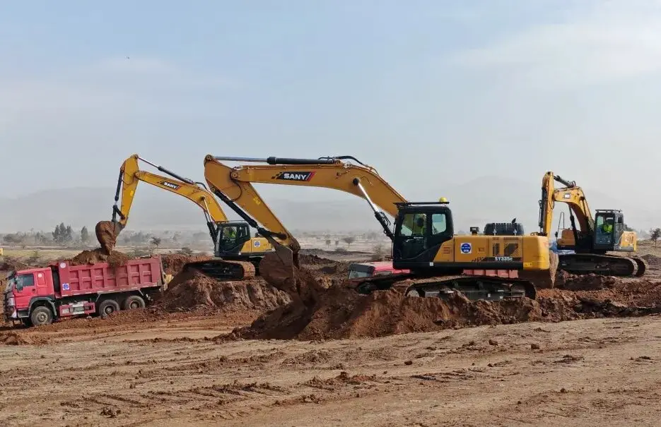 三一集团10台SY335C挖掘机已运抵埃塞俄比亚比绍夫图国际机场项目现场,该项目总投资125亿美元,是非洲最大航空枢纽。三一将共交付50台设备,为项目土方工程提供支持,并承诺提供全天候服务保障。