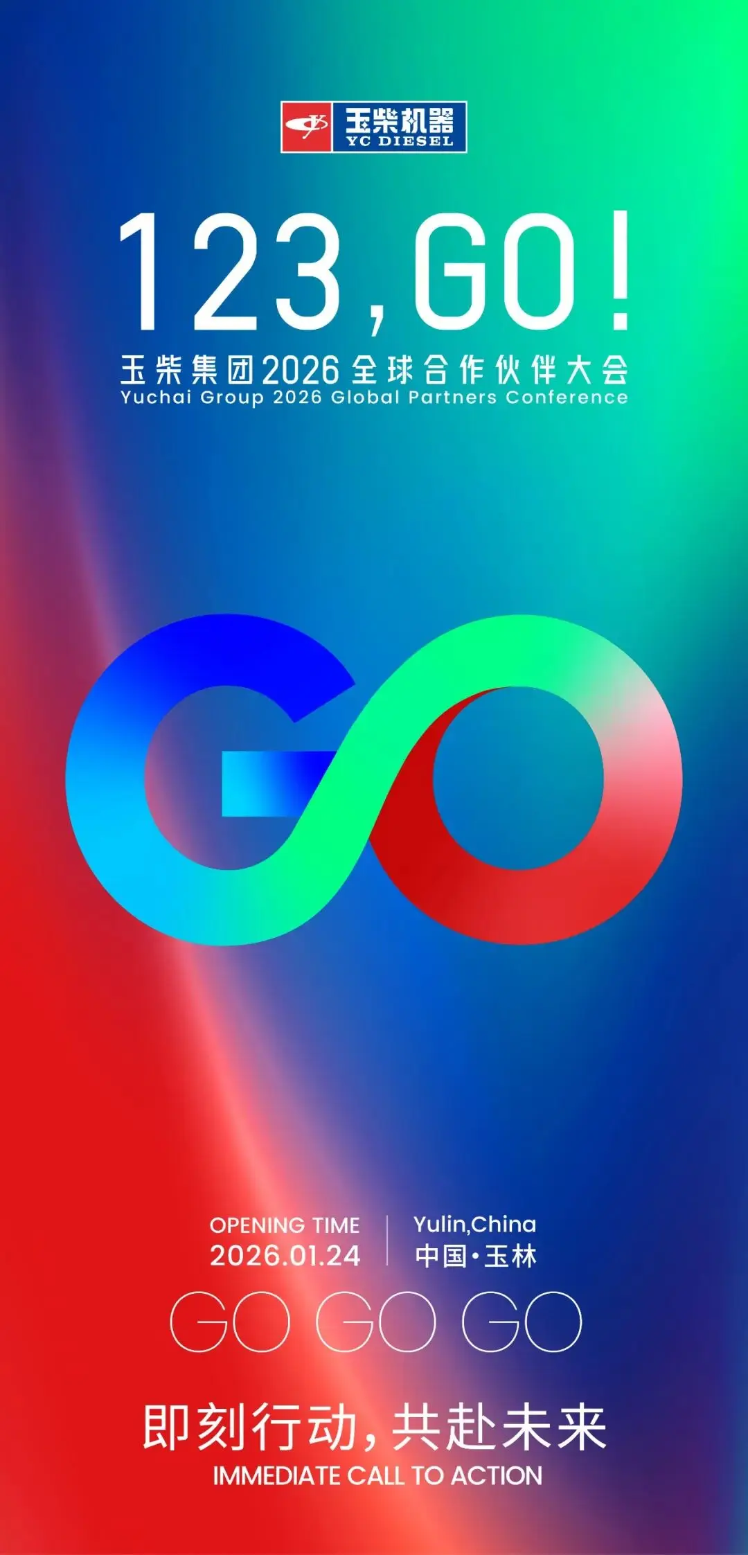 玉柴集团发布2026全球合作伙伴大会主视觉形象,以'123,GO!'为主题,采用红、绿、蓝三色交融设计,象征传统动力、新能源动力与智能装备三大赛道的并行发展,展现企业从传统动力制造商向多元化科技集团的战略升级。