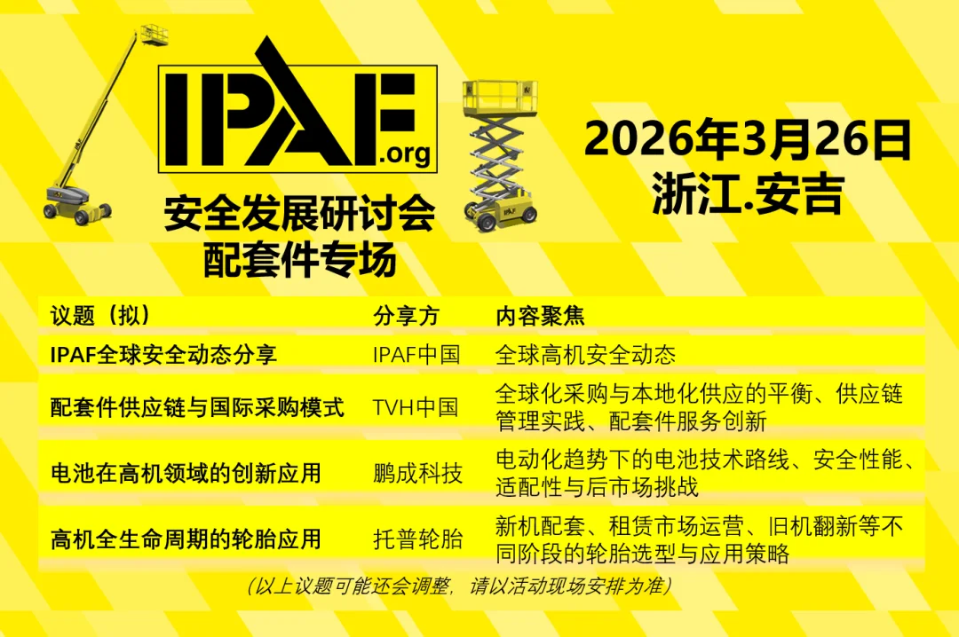 IPAF将于3月26日在安吉举办安全发展研讨会,聚焦高空作业平台配套件技术迭代与安全发展,汇聚产业链力量共同探讨技术与实践,席位有限,报满即止。