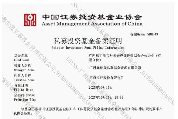 柳工集团全资子公司柳工鑫世晟基金管理的柳工战兴未来基金完成备案,总规模10亿元,将聚焦主业升级和战兴拓展双主线进行投资布局,助力柳工集团产业升级和经济发展。