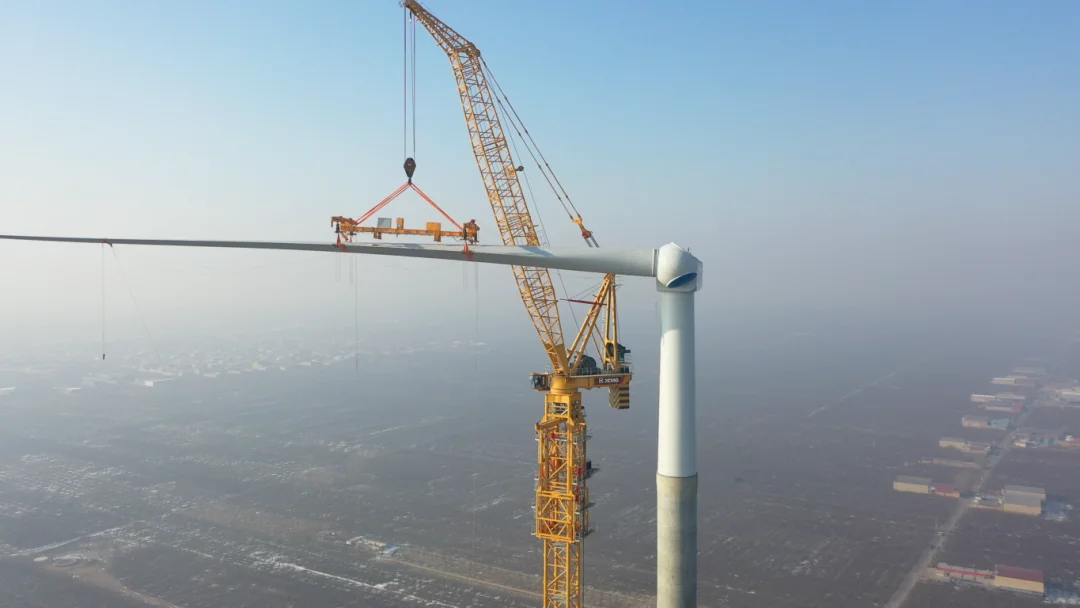 徐工塔机生产的XGL3300-220S塔机在华北平原的400MW风电项目中发挥了关键作用,其独特的无附着、无基础独立落地设计使其能在狭小的果园间快速部署和灵活作业,有效保障了工程进度和经济效益。