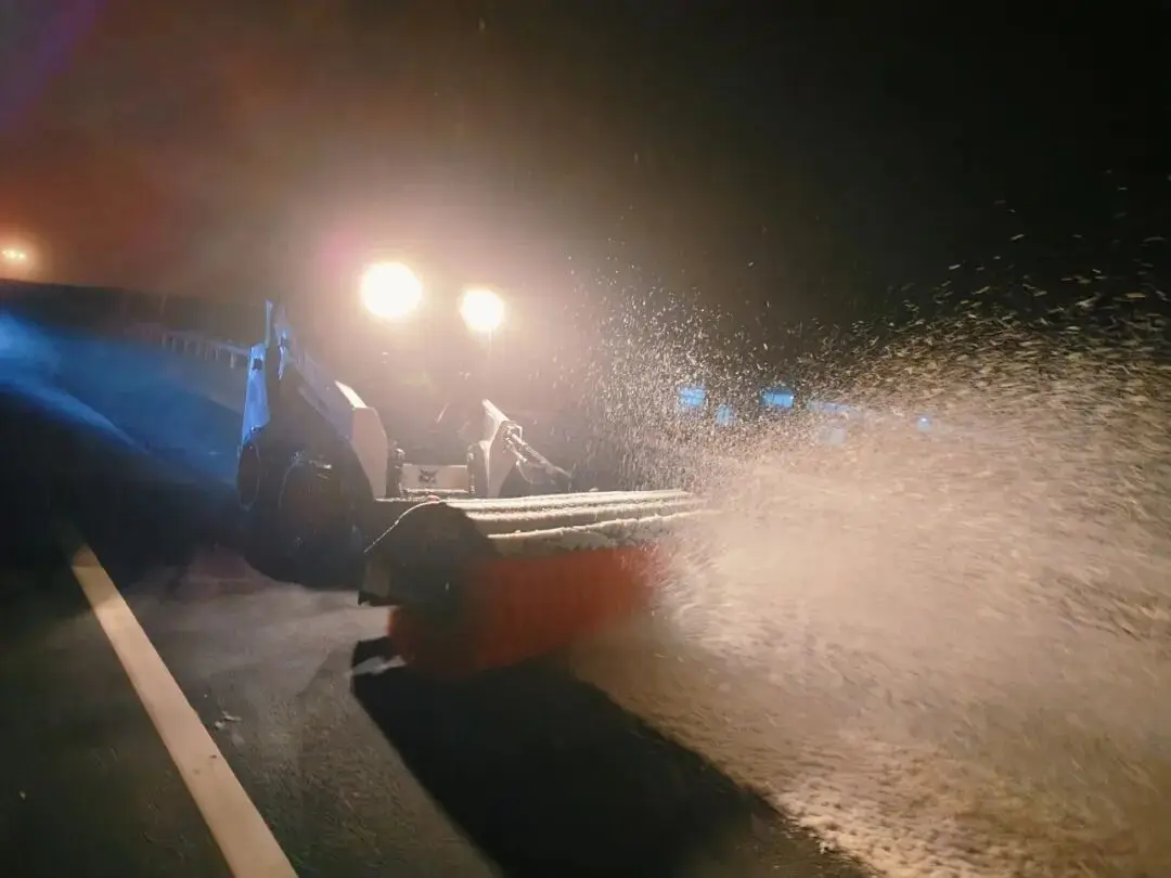 山猫S590滑移装载机在乐西高速银厂沟隧道段执行冰雪清除任务,通过V型推雪板和斜角清扫器两种属具配合,高效清除积雪,保障了这条重要山区高速公路的冬季通行安全。