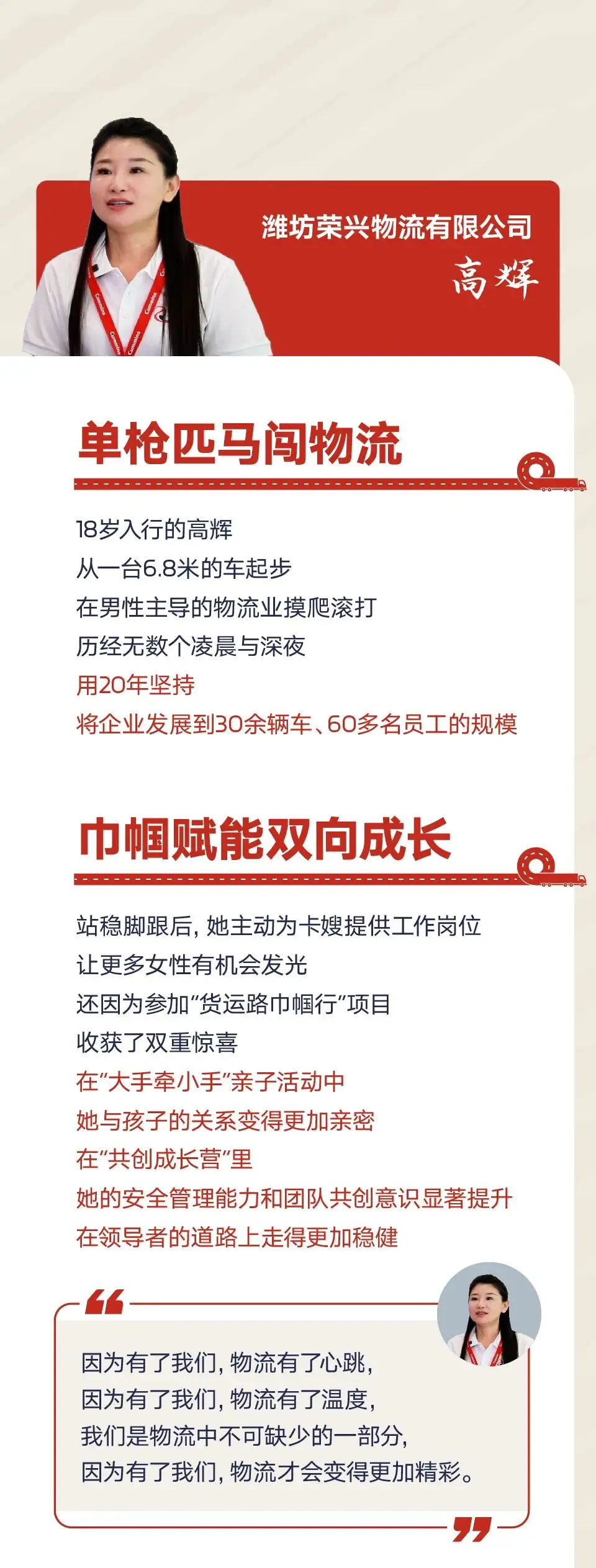 文章来源于康明斯中国,主要讲述了女性在物流行业中的作用,提升了物流的温度和人性化。
