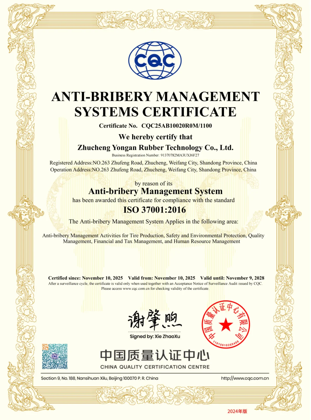 赛轮集团旗下潍坊工厂荣获ISO 37001反贿赂管理体系认证,标志着其在廉洁合规治理与风险防控能力上取得显著进步,展现了公司坚守诚信经营和履行社会责任的决心。