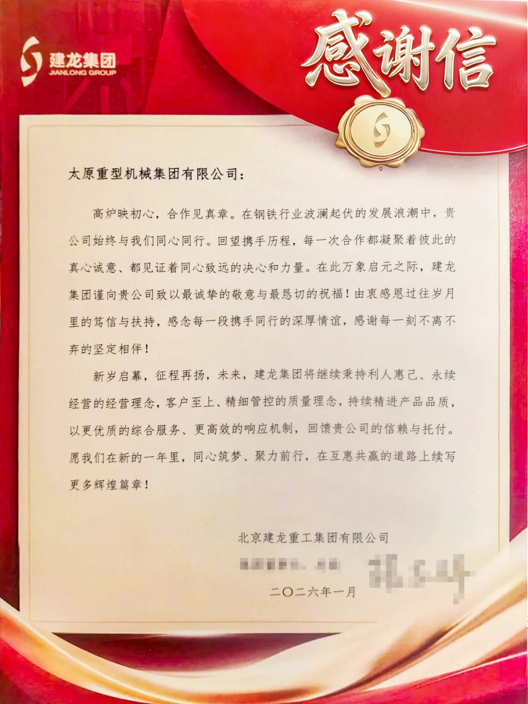 太重集团收到北京建龙重工的感谢信,双方作为战略合作伙伴在轧钢、起重机、焦化设备等领域展开深度合作,太重提供从设计到运维的全周期服务,推动互惠共赢。