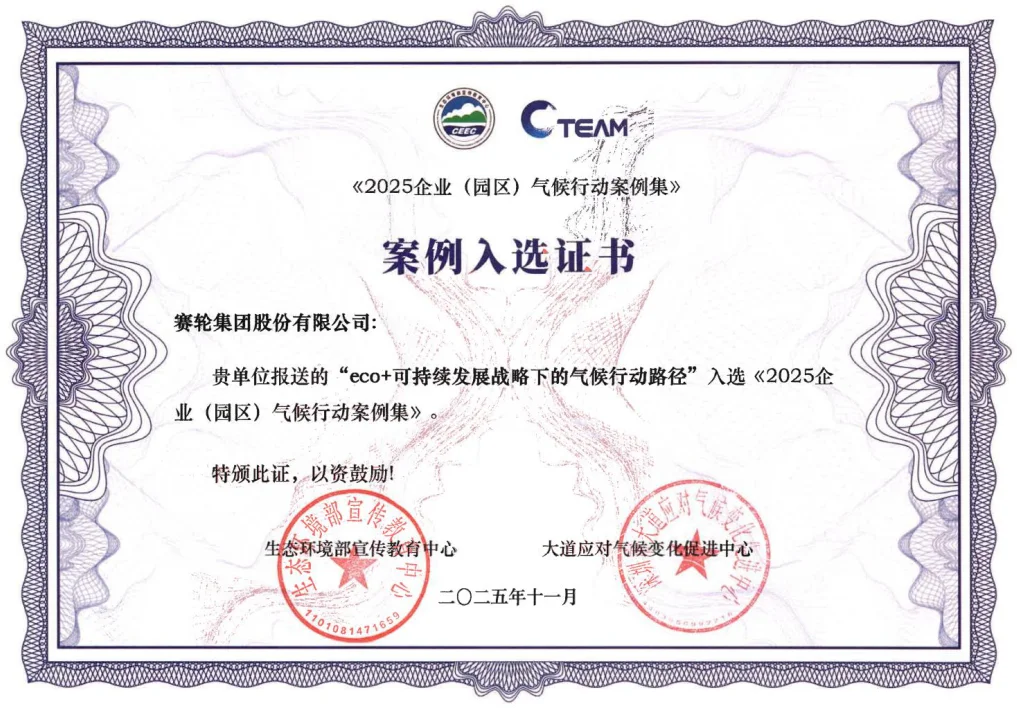 赛轮集团因其'eco+可持续发展战略下的气候行动路径'案例入选联合国气候变化大会的《2025企业(园区)气候行动案例集》,成为轮胎行业唯一入选企业。该案例展现了赛轮集团在气候创新领域的行动和实践,得到了高度认可。