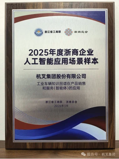 杭叉集团在2026浙商年度主题大会上荣登"2025年度浙商企业人工智能应用场景样本"榜单,其"工业车辆知识图谱在产品销售和服务(智能体)的应用"项目成功入选,展现了企业在工业车辆智能化领域的创新实力。