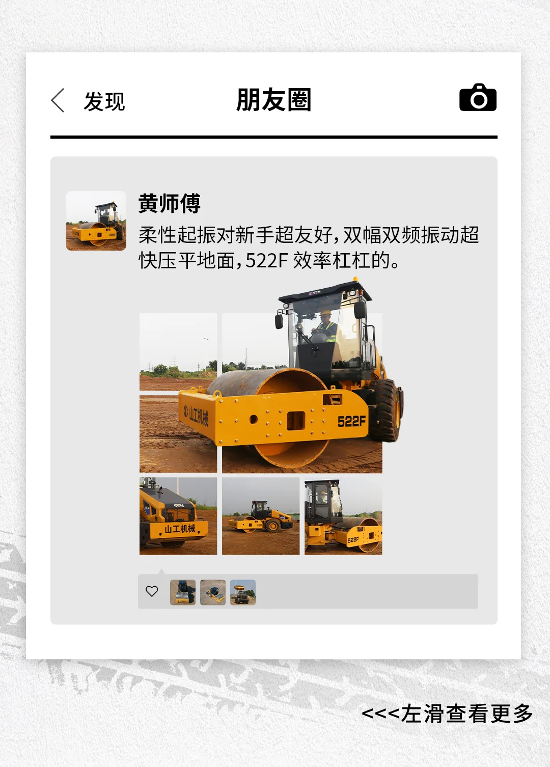 山工机械在朋友圈中分享了522F压路机的相关信息,展示了不同机友对该款压路机的赞赏点,并可能包含图片展示和用户评价。