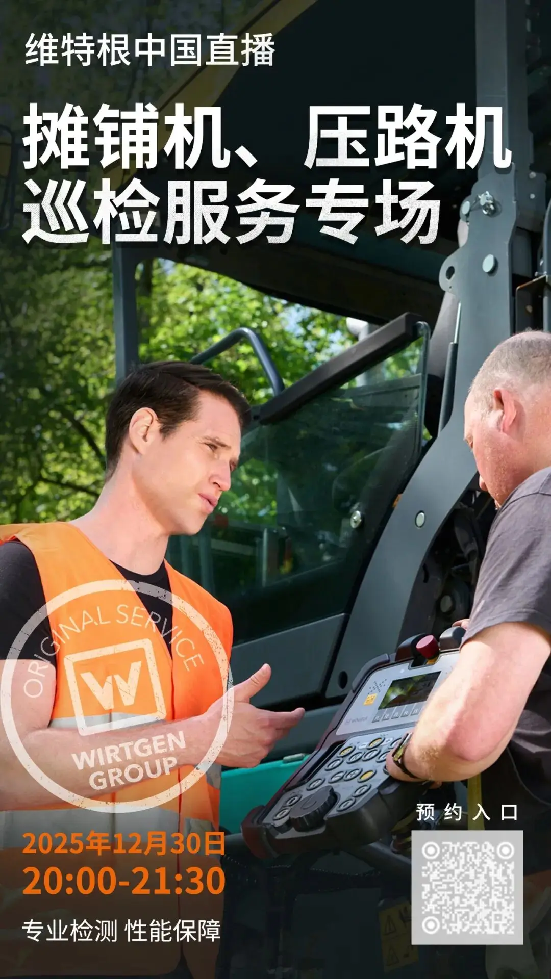 维特根中国宣布将举办摊铺机和压路机巡检直播,聚焦标准化巡检流程,旨在帮助机主和机手提升设备出勤率,减少返工损失,直播将详细讲解巡检流程和风险。
